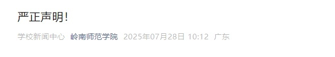 近日,我校发现今日头条、懂车帝、抖音等多个网络平台出现“岭南师大留学生配陪读”等不实言论。此类言论严重误导社会公众,致使部分网民误认为我校存在相关情况,对学校声誉造成严重损害。为维护我校合法权益与社会声誉,特此严正声明如下:
