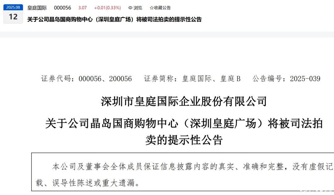 在旗下知名商业地标进入司法拍卖程序引发市场广泛热议后,深圳市皇庭国际企业股份有限公司(以下简称“皇庭国际”)于8月11日晚间发布提示性公告,就晶岛国商购物中心(即深圳皇庭广场)将被司法拍卖事宜作出正式回应。